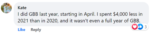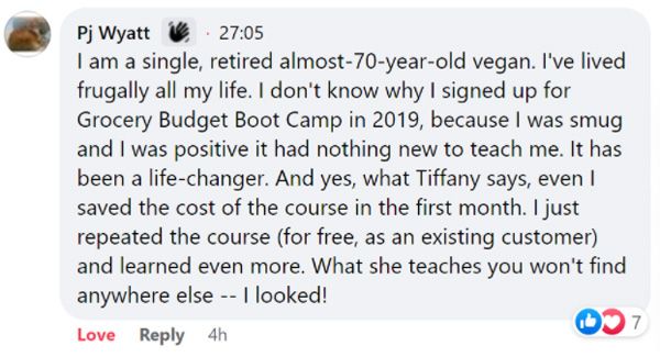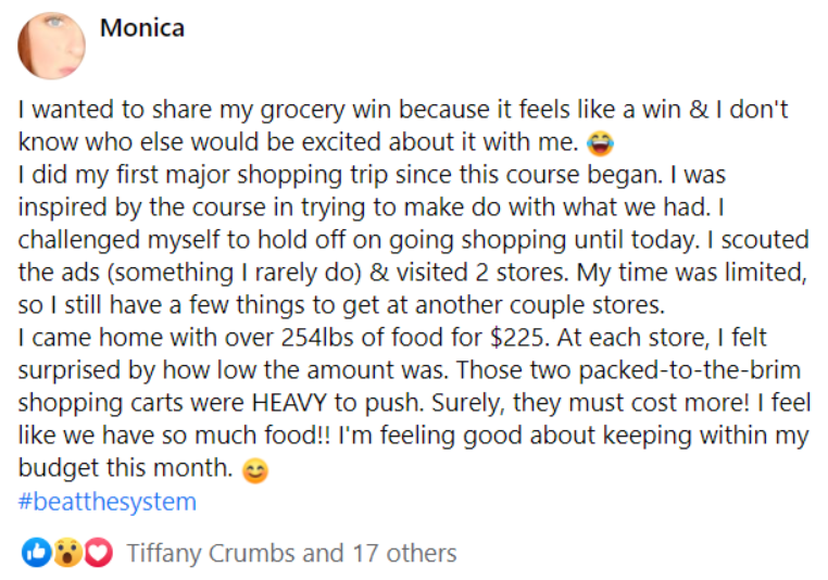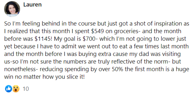 I was spending upwards of $400 before taking the course, and I’ve easily reduced my budget to $300 even with moving to a new state. My goal is $250/month, which I should easily be able to achieve in the next few months, even with rising costs!”